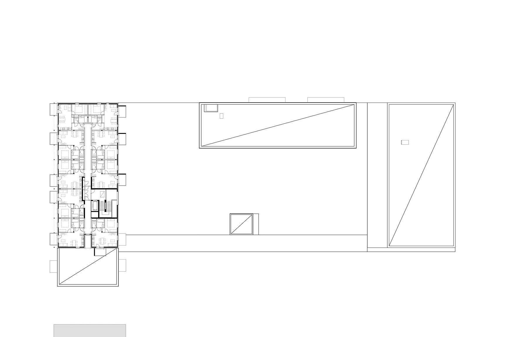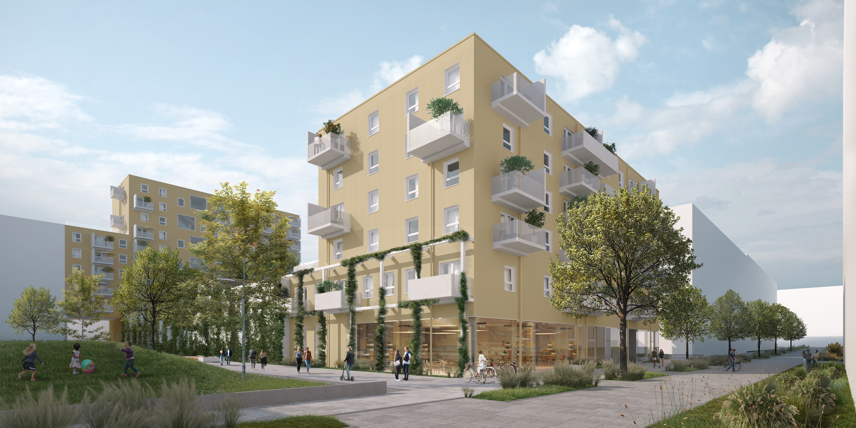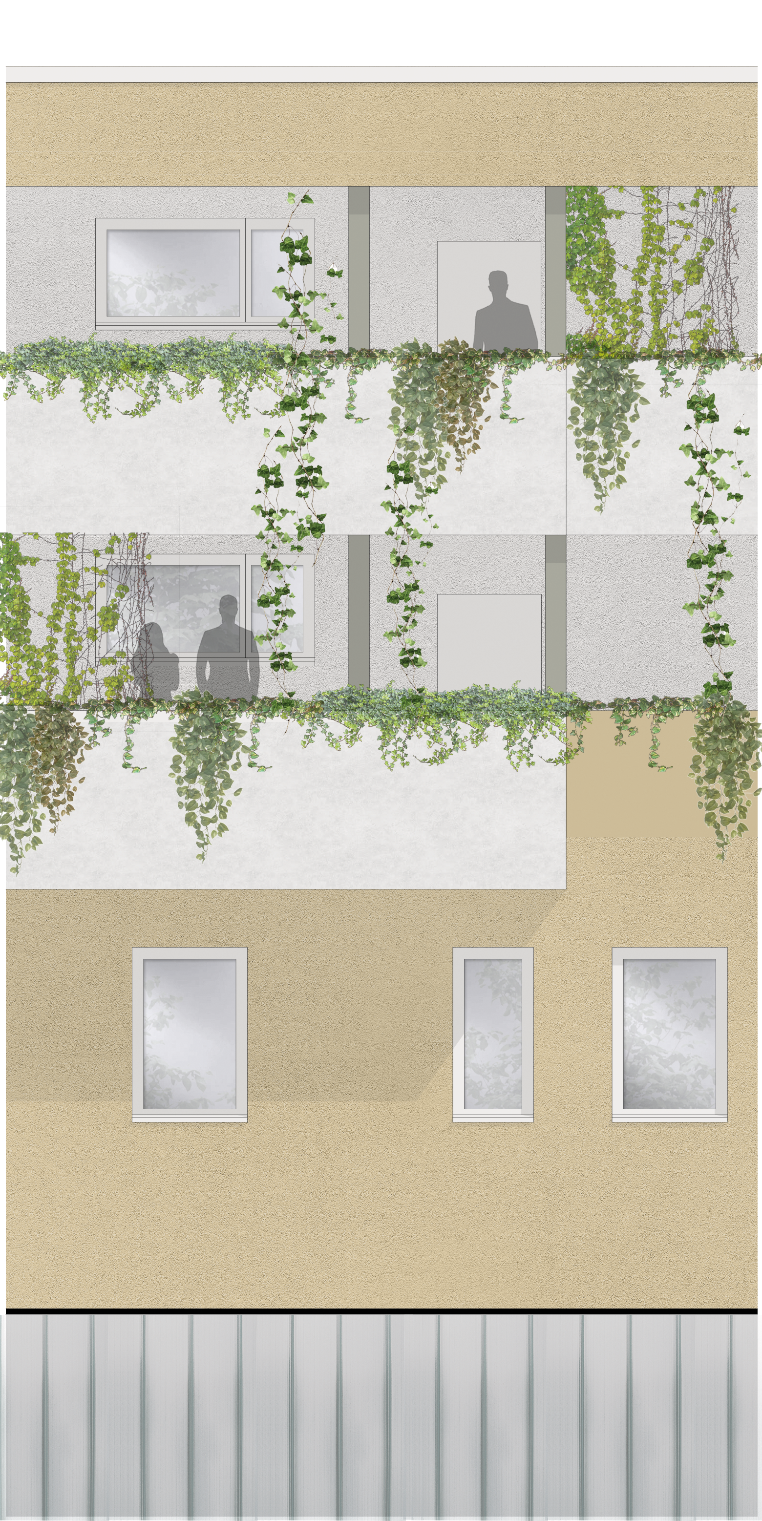 Im Westen bildet ein neungeschossiger, aufgesetzter Baukörper einen Abschluss Richtung U-Bahntrasse und ist zugleich Puffer für die östlich gelegene Bebauung. Das vorgelagerte 'grüne Regal' wirkt hier als zusätzliche Pufferschicht für die dahinter liegenden Wohnungen und bildet zugleich eine attraktive Schauseite zur Bahn. Die zweigeschossigen, zur Franz-Wels-Gasse orientierten, Gewerbeflächen beleben die Erdgeschosszone.