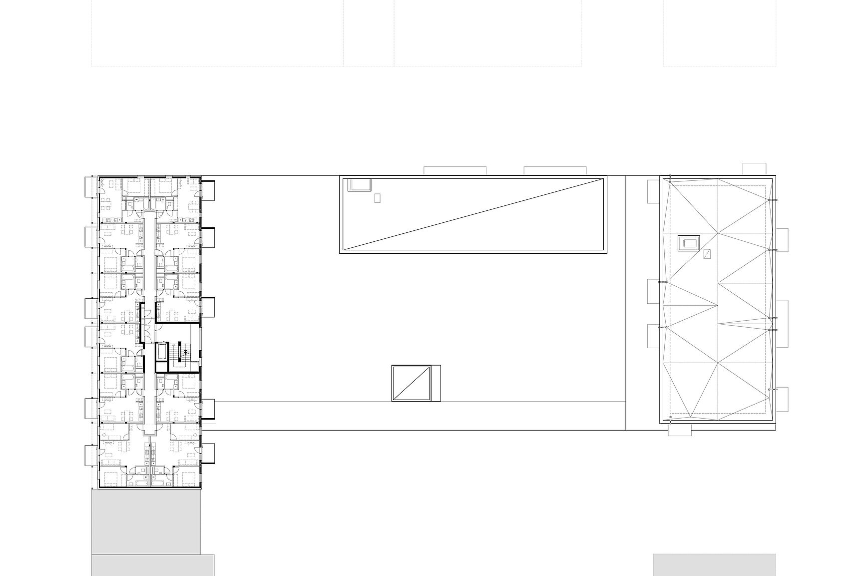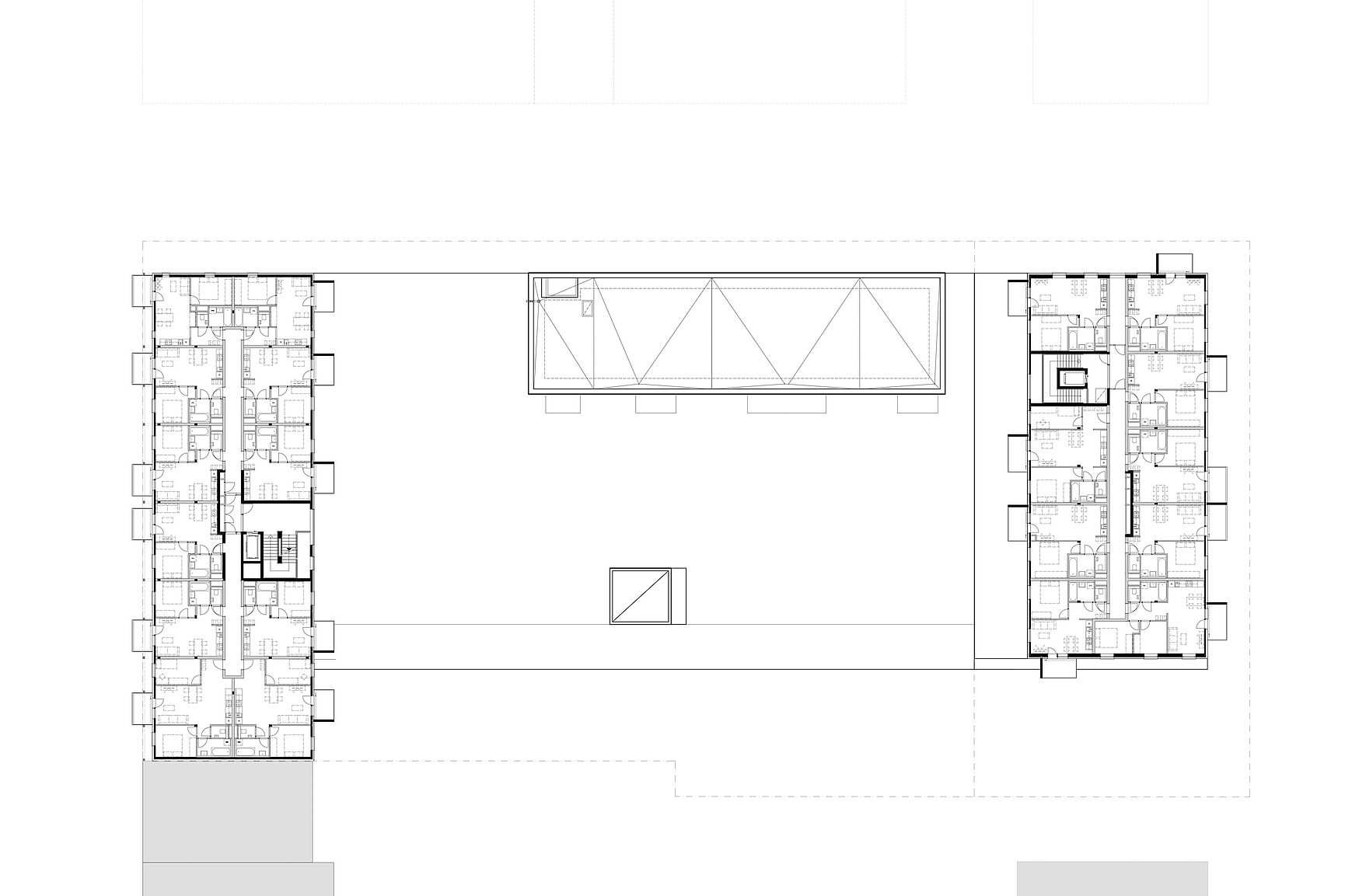 Das dahinterliegende natürlich belichtet und belüftete Parkdeck schafft zum Baufeldinneren einen vom Straßenraum abgehobenen und halböffentlichen Hochgarten für die Bewohner:innen - nördlich und östlich eingefasst von zwei Baukörpern mit 3 bzw. 4 Geschoßen über dem Sockel.