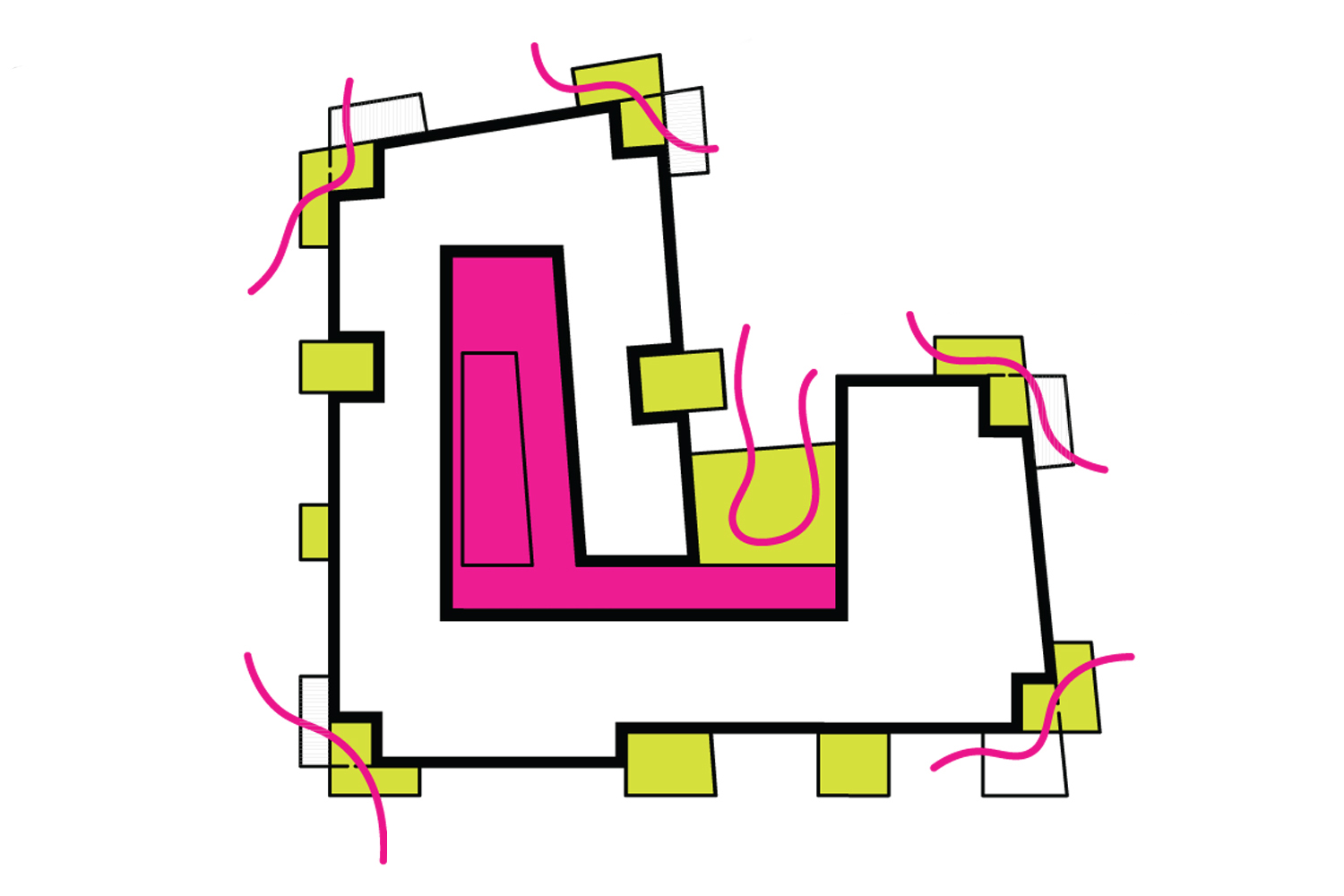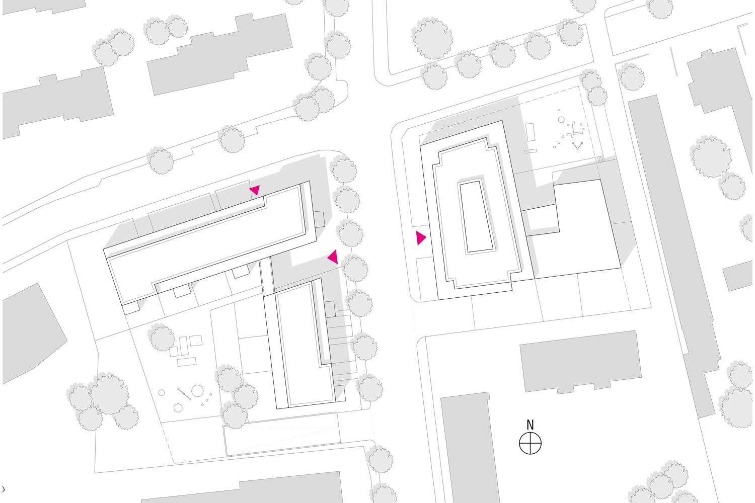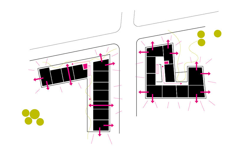 Die Widmung für das östlich der Grutschgasse gelegene Gebäude sieht eine L-förmig zur nordöstlichen Freifläche orientierte Bebauung mit Trakttiefen zwischen 18 und 20m vor. Darauf aufbauend wurde das Gebäude 2-hüftig rund um ein zentrales Atrium organisiert. Die gemeinschaftlichen Flächen befinden sich zentral im Gebäude im Erdgeschoss und verfügen über einen Zugang zum Garten.