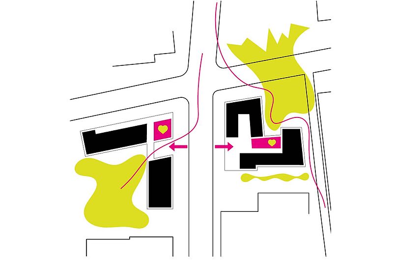 Die der Wohnanlage im Nordosten zugeordnete Freifläche knüpft an den nördlich der Quellenstraße gewidmeten Park und an die vorgesehene Fuß- und Radwegverbindung an. Durch die vorgesehene Verkehrsberuhigung der Quellenstraße kann ein niederschwelliger Übergang der Quellenstraße und eine Verwebung der beiden Freiflächen angedacht werden.