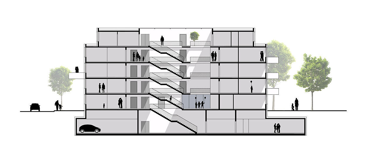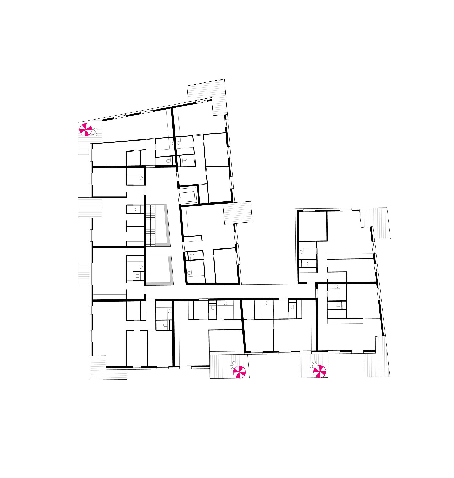 Die Wohnungen werden über ein helles und großzügig dimensioniertes Atrium erschlossen. Ein Gebäudeeinschnitt im Nordosten zum Hausgarten ermöglicht die natürliche Belichtung der Gang- und Erschließungsbereiche. Zugleich werden dadurch nach Norden orientierte Wohnungen vermieden. Alle Wohnungen verfügen über großzügige zugeordnete private Freiflächen in Form von Loggien und/oder Balkonen. Durch die geschossweise versetzte Anordnung der Balkone verfügen diese jeweils über geschützte eingeschossige Bereiche sowie offene, 2-geschossige Zonen.